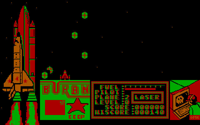 Итак, инопланетяне вторгаются на Землю - и остановить их может вовсе не США, а только СССР со своим "Бураном". Нужно взлетать и отправляться на космический бой, - в этом весь сюжет. Сюжет, но не процесс, потому что разделена игра на два этапа: собственно запуск "Бурана" в космос и только потом - вполне себе традиционный, довольно сложный и, прямо скажем, не особенно увлекательный "шмап" с видом сверху; впрочем, можно и сразу перейти к стрельбе, но так не интересно. Если смысл первого игрового режима удалось понять верно - то нам нужно за ограниченное время заставить корабль взлететь, нажав на кнопки и рычаги в правильном порядке; действие разворачивается в кабине ракетоплана с видом от первого лица. Затем придётся истреблять орды вражеских корабликов, пролетая в том числе над странного вида космическими станциями, попутно собирая бонусы в виде ускорения, топлива (оно в игре конечно) и новых видов оружия (текущее оружие отображается в нижней части экрана), а также дополнительные "жизни".