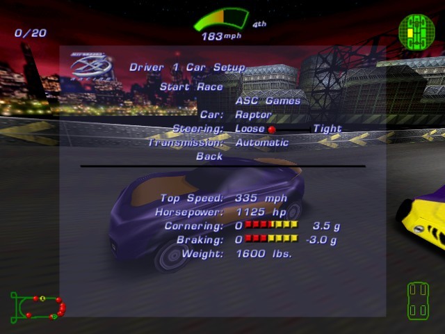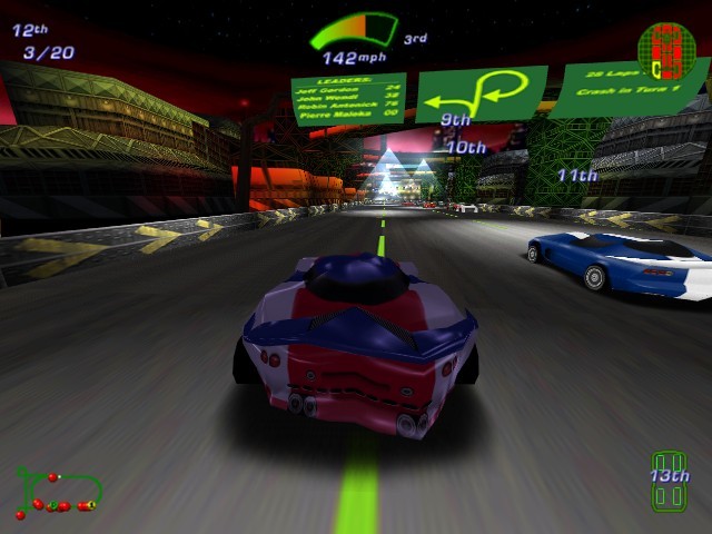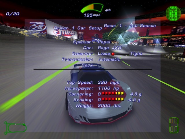 Непосредственно перед началом состязания можно выбрать один из шести выдуманных автомобилей и раскрасить его в цвета спонсоров - как реальных, так и вымышленных. Настройке поддаются также чувствительность рулевого управления, количество кругов и соперников (их может быть аж 39). Перед тем как выпустить игрока на асфальт, Джефф проведёт брифинг, в котором расскажет об особенностях трассы и даст советы по прохождению. Все уровни созданы в футуристической стилистике, переполнены освещением и вообще выполнены в ярких тонах и вызывают самое приятное, что есть в игре, – чувство скорости. Оно появляется в первом же заезде, когда автомобили на скорости свыше 200 километров в час мчатся среди электрических огней и парят на пригорках (в этот момент выдвигаются небольшие крылья).