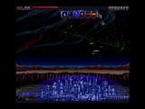 Красивейший город под куполом и космический фон - вот и все декорации. Впрочем, для подобной классической аркады большего сложно требовать. С точки зрения графики отдельно стоит отметить заставку при проигрыше - некий монстр, подозрительно напоминающий продавца из Xenon 2 (или Хищника, к примеру), сидит на фоне горящего города и тарелок, ощупывающих лучами поверхность планеты; всё это сопровождается печальной музыкой и соответствующими надписями, а также скрипучим голосом самого инопланетянина.