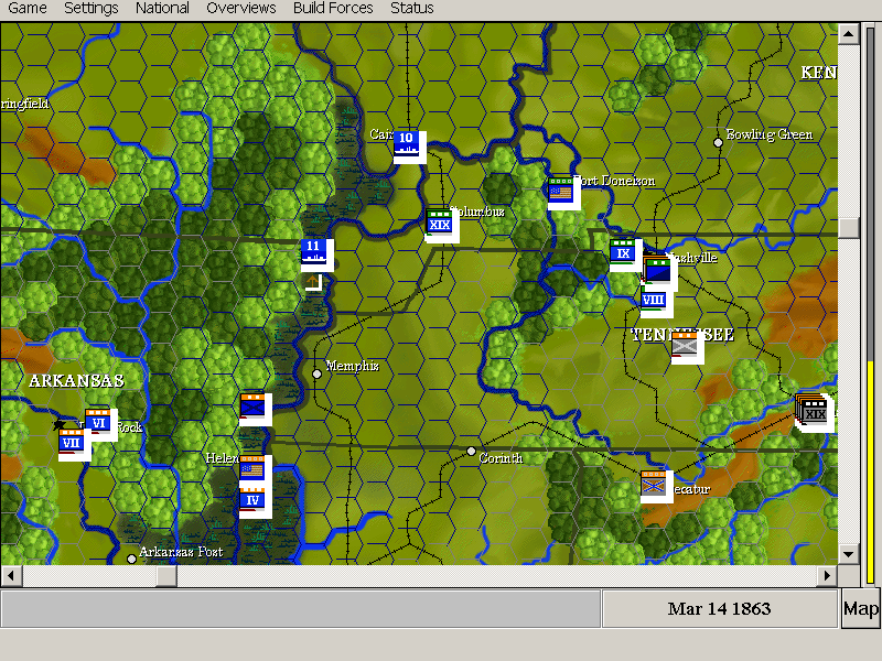 Экономика: грамотное управление "народным хозяйством" - залог успеха в войне! В игре имеется два вида ресурсов (при игре за КША добавляется третий - хлопок): люди и, скажем так, некие производственные ресурсы, выраженные в условных единицах. От количества людей зависит не только число бригад, которые вы можете сформировать, но и скорость производства оружия. Заберете всех в армию - некому будет стоять у станка. Второй ресурс тратится на производство оружия и снабжение войск - тут необходимо грамотно распределять его между штатами в зависимости от текущей обстановки на фронте. Касательно хлопка - у КША производственные ресурсы не самовосполняемы, а приобретаются в обмен на поставки хлопка.
