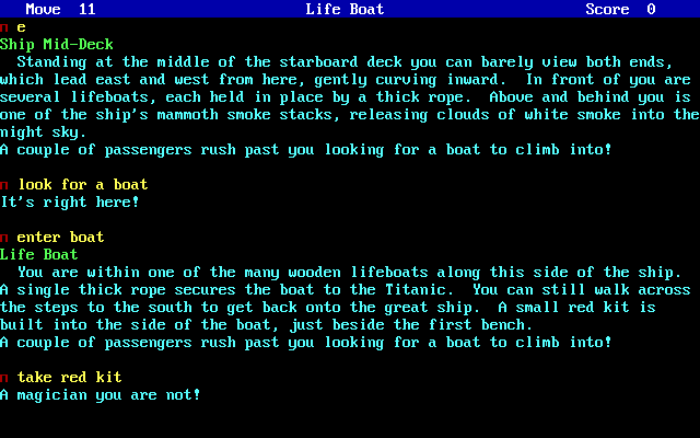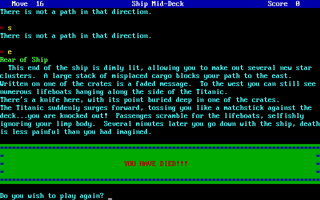 Жанровая принадлежность определяется очень чётко – это interactive fiction, говоря по-русски – текстовый квест. В роли безымянного героя, являющегося пассажиром фатального рейса, игрок должен спастись с тонущего корабля. Но, как можно догадаться по названию, на этом приключения совсем не заканчиваются. По стечению обстоятельств протагонист оказывается в шлюпке совсем один и не попадает на борт прибывшего на сигнал о помощи судна. Вместо этого он оказывается в какой-то пещере, и становится понятно, что столкновение с айсбергом – далеко не единственное обстоятельство, способное привести его скорейшей гибели.