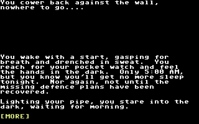 Хотя, по правде сказать, всё не так уж и плохо – если не считать не самый приемлемый уровень технического исполнения: не только загрузку каждой локации, но даже и реакцию искусственного интеллекта на любые вводимые нами команды ожидать приходится чересчур уж долго (Warp-режим эмулятора спасёт отца британского сыска!). Парсер при этом понимает практически все классические глаголы и сокращения (игра выполнена «неофициально» на движке Infocom; управляющие команды при желании можно освежить в памяти посредством HELP): восемь направлений движения, L для осмотра текущей локации и I для вызова инвентаря, Х для подробного изучения предмета, G для повтора предыдущего действия и Z для ожидания (уместного в некоторых ситуациях, завязанных на реальном времени). Описания локаций достаточно подробные и художественные; при желании можно попросить автора быть полаконичнее, использовав команды BRIEF или даже SUPERBRIEF. Наконец, команда SCORE покажет ваш прогресс сообразно полученным в ходе прохождения очкам (от 0 до 100). Иного интерфейса здесь никакого нет – лишь вверху экрана отображается название текущей локации.