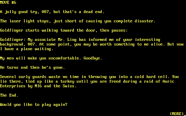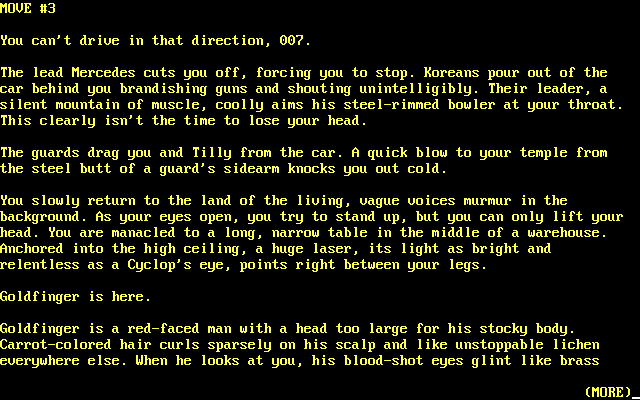 Разумеется, крутить Goldfinger ничего не позволяет — это всё тот же типичный текстовый квест с разделением на локации, но, признаться, начало весьма эффектное. Однако на этом радость и заканчивается: ведь смотреть, вернее — читать его придётся не один десяток раз. Что требуется сделать, чтобы не перечитывать? Уметь хорошо догадываться. Если то, в какую сторону ехать, ещё можно прикинуть по описанию на экране, то о том, что в машине есть гаджеты, каковы их функции (команды вроде «осмотреть» тоже забирают игровое время), в какой последовательности и на каком этапе их требуется активировать, — нужно долго узнавать методом тыка. И это лишь вступительная часть.