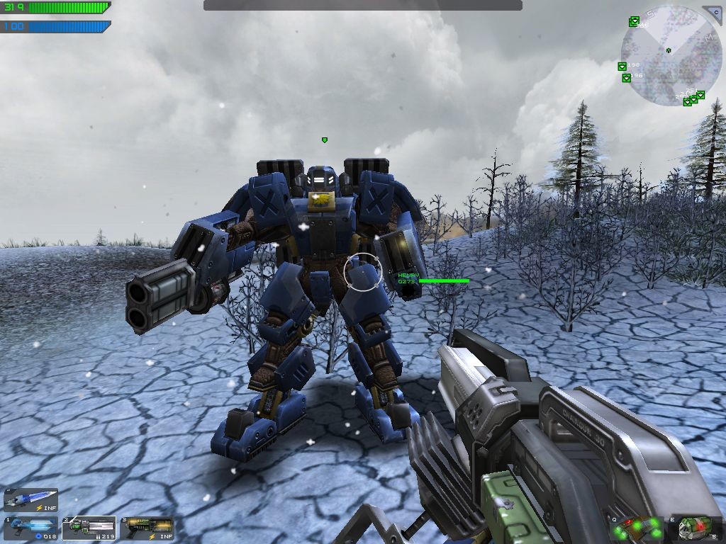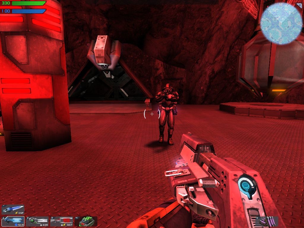 Всего персонаж может нести три вида оружия, плюс силовое лезвие для ближнего боя и гранаты. Самих «стволов» в игре не особо много, но те, что есть, весьма неплохи и разнообразны – тут и пулемет, и дробовик, стреляющий на манер Flakcannon из Unreal, выпускающий во врагов сгустки пламени «выжигатель», гранатомет, мортира, снайперская винтовка, многоствольная ракетница и оружие, ставшее визитной карточкой игры, – своего рода ракетница, стреляющая разрывными дисками, оставляющими за собой ярко-голубой «хвост». Есть и экзотика – силовой щит, уменьшающий урон от вражеского огня, который можно метнуть в противника и который, подобно бумерангу, возвратится к бросившему его бойцу. При этом каждый вид оружия имеет свои тонкости, которые следует учитывать при использовании: пулемет перегревается, от чего увеличивается разброс пуль, а заряды дробовика рикошетят от препятствий и могут вернуться к стрелявшему… Также все «стволы» могут стрелять в снайперском режиме, что весьма повышает точность и наносимый урон.