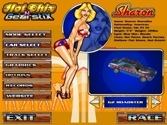 Собственно, кроме гонщиц, в игре и выделить-то особо нечего. Ни сюжета, ни роликов здесь нет. Нам предстоит выбрать одну из шести девушек, причём изображение красоток в полный рост занимает чуть ли не треть экрана. Среди них есть и русская с мужским именем Ивана - у неё и машина соответствующая: с красной звездой. У каждой девушки своя тачка, причём представлены мощные - так называемые "мускулистые" - автомобили 1970-х годов. Никаких характеристик машин мы не увидим, зато узнаем рост, цвет глаз, что любит и не любит каждая красотка. Вот, оказывается, что важно для гонки!