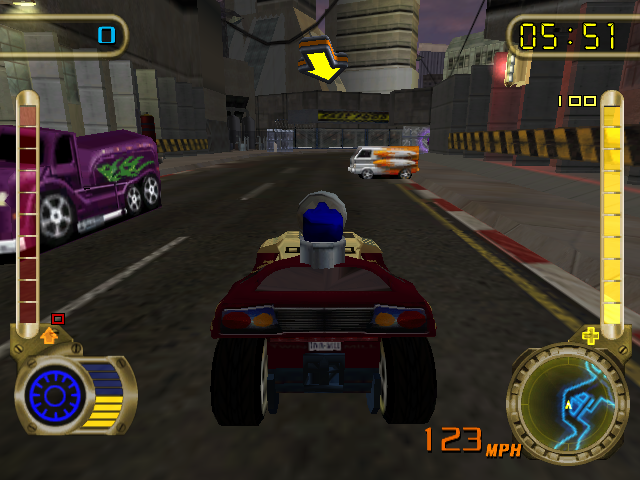 Отличаются они, помимо моделек, четырьмя шкалами: скорость, управляемость, бронирование и склонность к выполнению трюков. С первыми тремя всё понятно, и плохо управляемой машиной здесь действительно неудобно рулить. Четвёртое - как и в Tony Hawk’s Pro Skater или других аркадах, и более чем уверен, что «фишка» уже проскакивала в предыдущих Hot Wheels-игрищах, - тут можно выделывать сальто в воздухе не выходя из автомобиля, ездить по стенам, прыгать с рамп и творить другие чудеса автоакробатики, что оценивается в очках и пополняет турбо-шкалу. По трассам разбросаны боевые или поддерживающие бонусы, а также разные преграды вроде дорожных блоков и конусов, отнимающие время при столкновении. И, что удивительно, в Velocity X частично разрушаемый мир! Почти все отдельно стоящие объекты на дороге, включая телефонные будки, лавки, ящики и просто припаркованные авто, можно разнести в клочья. И такой подход вселяет аккуратную надежду.