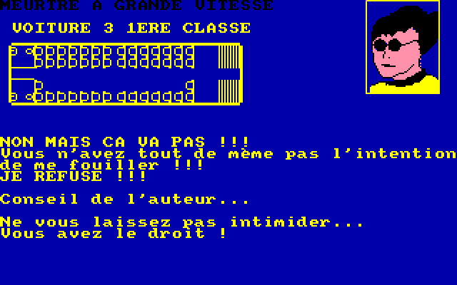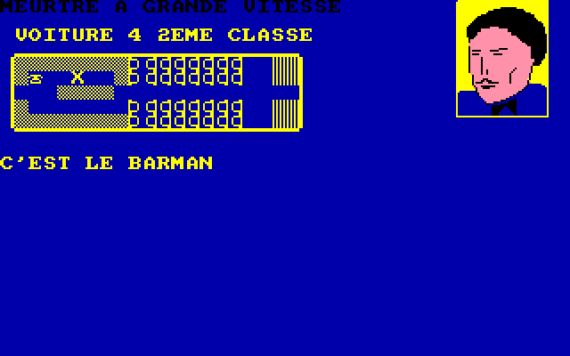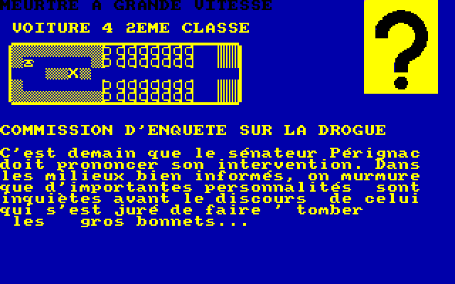 В большинстве случаев ответом будет «Il n’y a rien de special...», – но временами нас ждёт указание на присутствие на данной «клетке» какого-нибудь пассажира (всегда называемого по имени) или объекта (чемодана, телефона, газеты и т. д.). Печатную продукцию можно прочитать командой «L»; нажатие клавиши «F» позволит осуществить обыск – нужно будет только уточнить, какой именно предмет следует обыскивать, одушевлённый («Р») или неодушевлённый («О»). Несмотря на то что людей в модном виде транспорта немало, «особо важных» индивидуумов – потенциальных подозреваемых – у нас всего только восемь: их портреты в обязательном порядке демонстрируются при начале игры (в любой момент их также можно просмотреть при помощи клавиши «Р»). В случае если кто-то из этих подозрительных лиц присутствует на одной ячейке с нашим «Х», его или её изображение сменит собой крупный вопросительный знак в правой верхней части экрана. Именно тогда можно будет приступать как к обыску, так и к допросу, вызываемому нажатием «I». После этого следует указать тему разговора, набрав число от 1 до 4, – некоторые «вопросы» (которые на экране в любом случае не отображаются – мы видим только монолог собеседника) разрешается задавать только после определённого события (обретения какого-нибудь предмета или разговора с другим свидетелем), причём вторично поговорить с одним и тем же человеком на ту же тему не разрешается. Наконец, в некоторых случаях нам доступно особое действие, осуществляемое нажатием клавиши «А» – и позволяющее, например, воспользоваться телефоном (для возврата к игре нужно будет отдать команду «Fin»).