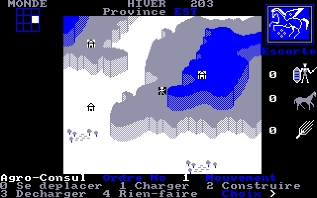 Дабы этого не случилось, вам в помощь выделены специальные чиновники – консулы в количестве трех штук. Каждый специализируется в определенной области народного хозяйства: транспорт, металлообработка, продовольствие. И это единственные юниты (есть еще цезарь, то бишь ваше альтер эго), которые могут перемещаться по игровому полю (последнее представляет из себя квадратный кусок карты, окрашенный в три цвета по количеству типов местности). Консулы выполняют в Empire ровно две функции: возведение предприятий для производства какой-либо продукции (зависит от их специализации) и транспортировка готовых товаров в столицу. Фермы и заводы можно строить лишь в строго определенных местах, которые отмечены на карте изображением «домика», и в строго определенной местности. Всего в игре три вида ландшафта: равнина – для ферм; скажем так, предгорье – для конных заводов; горы – здесь строим кузни для производства оружия. Что касается транспортировки готовой продукции – у каждого консула есть два показателя: «грузоподъемность» и «скорость» (то есть количество очков движения). Первый определяется числом людей в свите чиновника (один человек равен одному грузоместу), второй – соответственно, наличием лошадей.