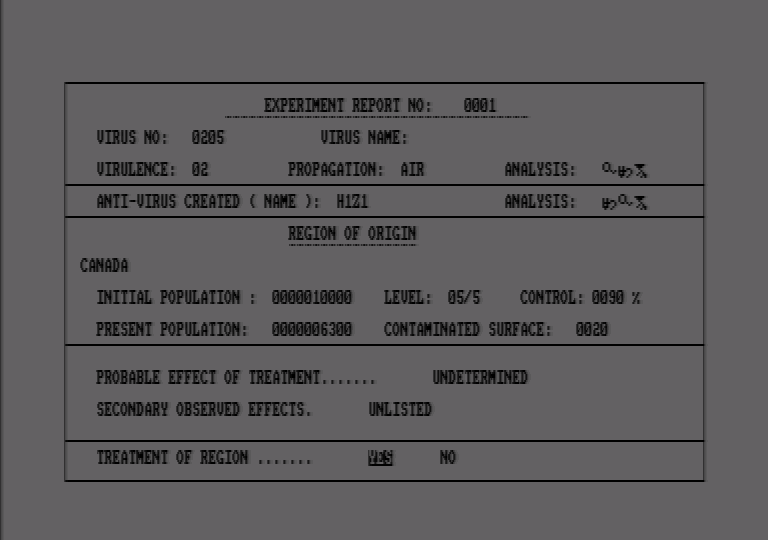 Contamination имеет два игровых экрана, между которыми можно переключаться. Первый – командный пункт. Выглядит как карта мира с кучей информационных панелей внизу. Здесь вам показывают пораженные болезнью страны, уровень населения планеты и его отношение к вам, а также продолжительность игры. Да, забыл сказать: Contamination идет в реальном времени, так что соображать придется быстро. Именно в командном пункте вам предстоит принимать решения относительно "больных" регионов. Всего их четыре: «сбросить атомную бомбу» – без комментариев; «выжженная земля» - весьма жесткая мера, позволяет снизить уровень зараженности, а заодно и вашу репутацию; «карантин» - наиболее мягкое действие, на некоторое время приостанавливает распространение инфекции, но не снижает ее уровень; «взять образцы вируса» - о, это самое интересное. В Contamination, в отличие от Epidemic!, у вас есть возможность собственноручно создать антивирус и «перейти в наступление» на пандемию.