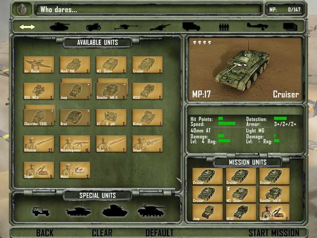 Сами машины войны тоже имеют разное назначение. При комплектации ими своего войска стоит учитывать не только ТТХ, но и особенности, например неподвижную башню некоторых танков или оснащение разведывательного броневика пулемётом. И нельзя забывать, что техника требует экипажа, - не окажитесь в ситуации, когда, взяв на миссию много танков и мало пехоты, вы просто не сможете использовать весь арсенал. Лучше, наоборот, взять немного больше стрелков (благо стоят они совсем недорого) и постараться заполучить трофейные вражеские машины: по окончании задания все выжившие войска остаются “в обойме” и даже получают повышение, благодаря чему возрастает их живучесть (второй уровень) и скорострельность (третий уровень). Для того чтобы захватить вражескую технику, необходимо выбить весь экипаж (вывести из строя двигатель или башню недостаточно - компьютер добровольно не будет выводить солдат). После каждого попадания все находящиеся внутри юниты получают урон и могут погибнуть раньше, чем произойдёт взрыв; особенно эффективен в этом плане огнемёт. Как только экипаж перестанет подавать признаки жизни, можно подгонять ремонтную машину, производить починку и захватывать танк.
