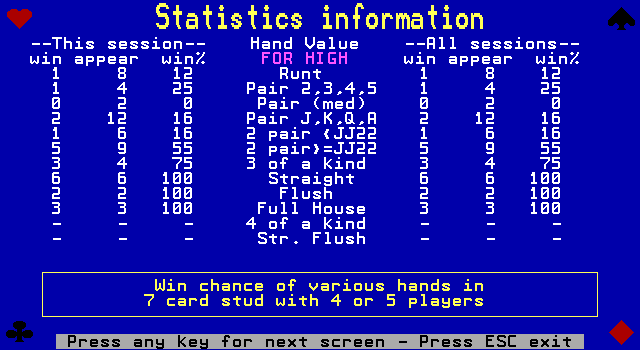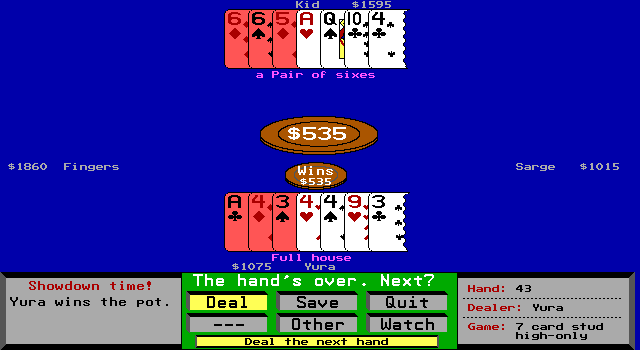 После каждого раунда можно выйти из игры, сохранив свой прогресс для последующего запуска программы или же окончательно забрав всю оставшуюся (или благополучно выигранную) сумму, запечатлев свой результат в таблице рекордов. Помимо этой последней оснащена «Amarillo Slim 7 Card Stud» и другими доступными в ходе состязания удобствами, такими как просмотр статистики по выпавшим комбинациям, подсчёт шансов на выигрыш с имеющимися у нас на руках картами, а главное – встроенный помощник-тьютор, у которого всегда можно спросить совета на предмет своих дальнейших действий (а то и включить постоянное отображение такого рода рекомендаций на экране).