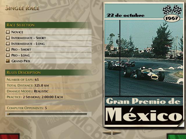 Но идти к ней придётся долго и упорно – Grand Prix Legends скрывает за красивой обёрткой суровое естество, не менее красивое для тех, кто разбирается в этом. Формула 1 не даром считается вершиной автоспорта – случайные люди сюда не попадают. Поэтому и игроку предстоит доказать свою состоятельность. И не стоит считать, что наличие нескольких режимов сложности даёт какие-то послабления. Они, конечно, есть, но дифференциация сделана лишь по степени реалистичности модели повреждений и продолжительности заезда. Тот, кто думает, что на сложности Novice он сядет в кокпит и без труда доедет до чемпионской короны, выходит уже на следующей остановке, которая с высокой вероятностью случится в первом же повороте. Grand Prix Legends – это гонки, честные и бескомпромиссные.