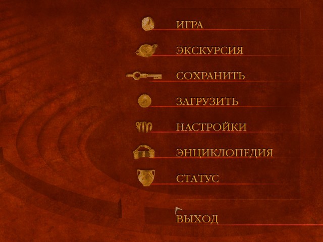 Заглянуть в энциклопедию можно и из основного меню, переключиться в которое помогает кнопка, расположенная выше панели инвентаря. Помимо банальных функций сохранения, загрузки и выхода доступны здесь и настройки (самый-самый минимум: регулировка громкости, инверсия стереозвука и включение или выключение субтитров), раздел «Статус» с демонстрацией нашего прогресса в прохождении игры в виде постепенно подсвечивающейся снизу античной вазы, а также «Экскурсия» – особый и крайне приятный режим, позволяющий свободно прогуляться по всем улицам и площадям Помпей с возможностью посещения и всех интерьеров, которые в режиме приключения никогда не бывают доступны нам целиком и полностью, открываясь только в меру следования логике стоящей перед Адрианом Блейком в настоящий момент задачи.