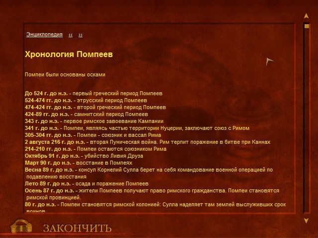Особым предметом инвентаря, обретаемым нами в самом начале, оказывается некий амулет: при нажатии на него открывается окно встроенной энциклопедии, часто – с подробными сведениями именно о текущей локации или стоящем рядом с нами персонаже. Ознакомление с историческим материалом совершенно необязательно для успешного прохождения самой игры, но местные статьи очень даже радуют своей информативностью и скрупулёзностью. Разве что по удобству использования помпейский энциклопедический словарь уступает своим аналогам от Cryo Interactive: текст подан строго отдельно от иллюстраций, хотя и снабжён гиперссылками, помогающими быстро перейти к изучению смежных предметов. Среди последних числятся и исторические персоналии, и местные достопримечательности, и более общие статьи о повседневной жизни, религии, экономике или политике древнеримского города – общим числом более ста двадцати наименований!