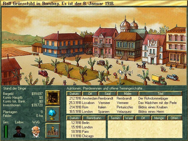 Несколько изменился интерфейс – и также в сторону большей наглядности и информативности. На экране города теперь отображается не только сумма наших текущих активов (кстати говоря, вместо пятидесяти тысяч марок, как в просто «Vermeer», в начале «Die Kunst zu erben» мы получаем на руки от дальновидного дядюшки сразу сто тысяч долларов, – видимо, дабы избежать возможных проблем с гиперинфляцией немецкой валюты) и прочая статистика, но и уровень нашего здоровья (нельзя постоянно без остановки путешествовать, временами нужно и отдыхать хотя бы в гостинице, если нет средств на обзаведение собственной резиденцией), а также наличие у нас телохранителя. Постоянно присутствующий здесь же портрет дядюшки позволяет справиться о его собственном здоровье: этот показатель теперь нужно вводить при начале каждой новой партии, вместе со своим днём рождения. «Болезненность дяди» – замаскированное указание на продолжительность игры: в зависимости от выбранной нами для него степени бодрости он умирает где-то в промежутке между 1923 и 1933 годом.