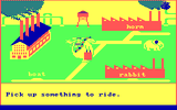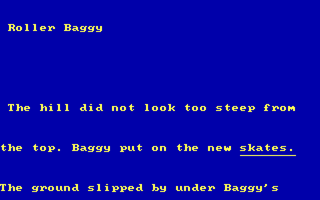 На выбор предлагается два режима: "короткий" и "длинный", которые отличаются только количеством представляемых игроку локаций (никакого "режима истории" не обнаружено, - хотя сама по себе "история" будет в обоих имеющихся). Процесс выглядит следующим образом: на экране изображены жёлтый прямоходящий динозавр с чемоданчиком, которого можно худо-бедно перемещать, "фоновые декорации", а также дорога, по которой двигается протагонист, и в некоторых местах около неё - те или иные слова или картинки предметов либо живых существ. Ниже всего этого в текстовом виде (на английском языке, естественно) представлено какое-либо задание, связанное с выбором одного объекта из видимых: например, нас могут попросить взять цвет, фрукт, животное с хвостом, слово, начинающееся на определённую букву, слово, синонимичное другому слову, и так далее. Наша задача - подводить динозавра, управляя им с помощью клавиш со стрелками, к нужному слову или изображению, и затем нажимать Enter, чтобы он его брал. Если мы сделали правильный выбор - то Багги (так зовут протагониста) радостно закивает и положит вещь себе в чемодан, после чего произойдёт автоматический переход к следующему экрану; если же вариант неверный - то помотает головой и не возьмёт объект, однако никакого "наказания" не последует.