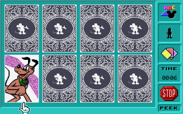 Все остальные, как уже было отмечено выше, однотипны (разница лишь в картинках: на них могут быть геометрические фигуры, бытовые предметы и так далее): перед стартом нужно определиться со "способом" партии (в одиночку, против живого человека за тем же компьютером либо против искусственного интеллекта; в последнем случае можно выбрать себе одного из трёх соперников: Гуфи, Микки-Мауса или Дейзи), количеством карт (восемь, пятнадцать или двадцать четыре), а также наличием (и, если они будут, числом) "диких" карт и карт-бомб. Первые весьма полезны: если во время хода такая карта взята второй по счёту (может ли она оказаться первой - неизвестно), то открывает вместе с собой и карту, идентичную только что перевёрнутой, и более того - право следующего хода тоже остаётся за нами. А вот "бомбы", увы, вынуждают того, кто случайно на них нарвался, пропустить ход. Каждая пара одинаковых перевёрнутых карт добавляет игроку десять очков. Партии ограничены по времени, и если по завершении работы секундомера поле ещё не очищено, то победа присуждается тому, чей результат в данный момент выше.