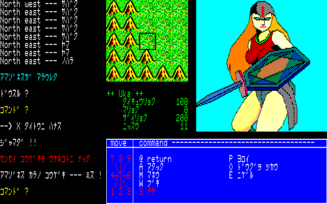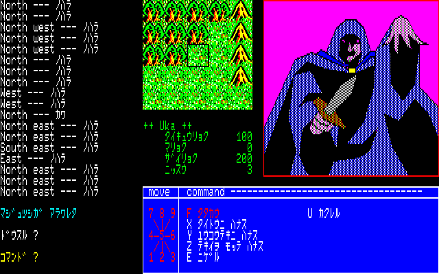 Мир представлен полем 5x5 клеток с видом сверху; перемещаться можно как стрелками, так и через Numpad. В любой момент можно вызвать набор команд, нажав клавишу 0; основными будут статистика (D), посещение города (I), выход с сохранением (R).