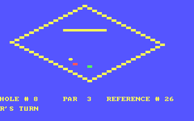 Что касается геймплея, то здесь всё очень просто: нам нужно загнать мячик в лунку, для чего необходимо выбрать направление удара и его силу от нуля до девяти с помощью соответствующих кнопок клавиатуры, а также учесть особенности геометрии поля. В качестве опции возможно выставить несколько игроков, чтобы по истечении партии можно было бы посмотреть сравнительную таблицу результатов.