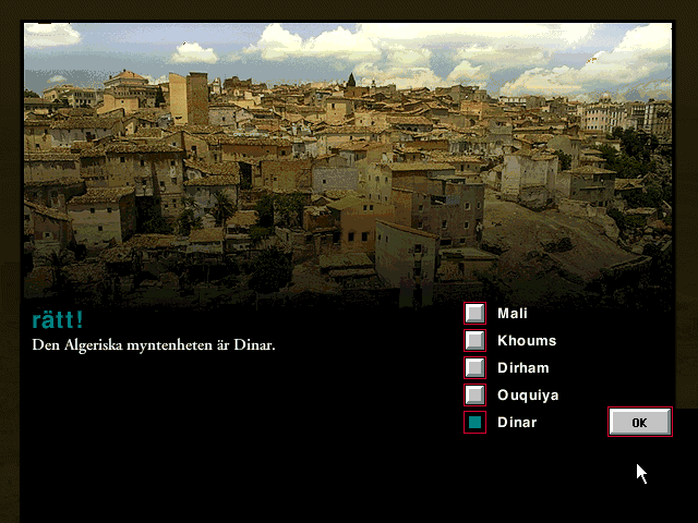К сожалению, при этом занимающая два диска вместо одного вторая серия умудряется выглядеть даже чуть хуже первой: почему авторы выбрали для главного меню чёрный-пречёрный фон со злостно мерцающими на нём элементами интерфейса кислотного цвета, понять сложно, – а ведь такое решение явно способно испортить начальное впечатление от знакомства с игрой. Дальше всё будет получше, но тоже как-то не особо привлекательно: привычная карта мира сменилась рельефной, но менее чёткой и расположенной на том же предельно мрачном фоне; к движущейся по ней хрестоматийной красной полоске нашего путешествия и к столь же странно, как и ранее, выглядящему «падению» самолёта в место назначения прибавились миниатюрные видеоролики поездки, пропускать которые не дозволяется; наконец, место стильных схем городов, которые нам предстоит посещать, заняли фотографии. Последние, как и все многочисленные снимки достопримечательностей, по традиции смотрятся слишком уж «любительски», однако если кое-где такое новое решение выглядит действительно уместным, – например, в Берлине, встречающем нас симпатичной чёрно-белой панорамой города, – то во многих других местах мы часто будем вынуждены любоваться размытым коллажем или невразумительным снимком с высоты птичьего полёта, разобрать на котором что-либо из местных достопримечательностей будет весьма сложно. Зато теперь при начале игры можно выбрать один из двух уровней сложности (для «туриста» вопросы викторины обещают быть немного полегче) и даже любой доступный город в качестве исходного пункта своего путешествия – заполучив на свою кредитную карточку начальную сумму в соответствующей национальной валюте (напомним, что в первой игре мы начинали свой путь исключительно в Гётеборге и с кронами в кармане).