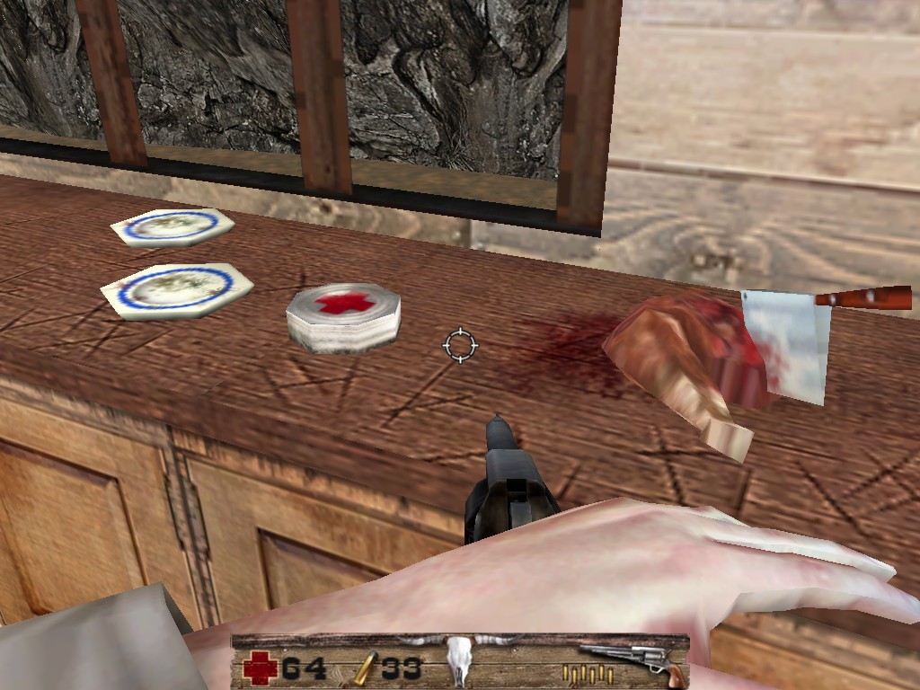 Если же говорить об экшен-составляющей Western Outlaw в целом, то проще всего охарактеризовать происходящее на экране термином «обычный бюджетный шутер». Каких-то «хитрых» игровых механик вроде замедления времени либо уничтожения противников с помощью объектов окружающей обстановки авторами не предусмотрено. В свою очередь, разновидностей врагов в Wanted Dead or Alive немного – примерно четыре типа «пеших» бандитов плюс всадники, встречающиеся на паре этапов. При этом «пехотинцы» различаются исключительно внешностью и вооружением, – основная масса оппонентов вооружена пистолетами, в то время как отдельные личности предпочитают дробовики и винчестеры. Поведение же всех бандитов абсолютно одинаково – они стоят на месте и стреляют либо бегут в сторону протагониста, а приблизившись, атакуют. При этом «стационарные» злодеи иногда пользуются укрытиями или даже высовываются из-за угла. Также некоторые супостаты, получив урон, отбегают от игрока на небольшое расстояние – видимо, для того чтобы собраться с силами и перевести дух. Единственной же интересной чертой врагов является то обстоятельство, что количество пуль в их оружии ограничено и, расстреляв весь боезапас, оппоненты начинают честно перезаряжаться, на чем их можно «подловить». На этом разговор о рядовых противниках можно было бы и завершить, кабы не «оригинальная» находка разработчиков. Дело в том, что отдельные вражеские бойцы обладают повышенным здоровьем и/или уникальным оружием, а пару раз Страннику доведется посетить локации, населенные бессмертными бандитами. От последних придется удирать, оперативно подбирая разбросанные авторами аптечки.
