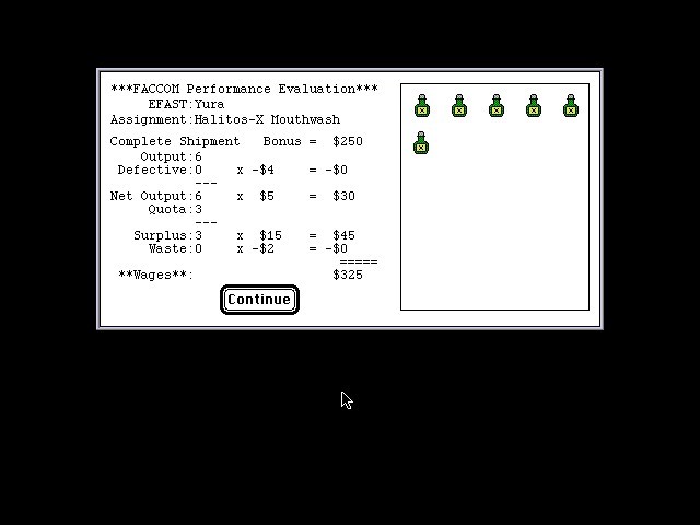 Кроме того, в самой игре ⌘D принудительно завершает текущий день: имейте только в виду, что безнаказанно уйти с предприятия домой пораньше можно лишь при успешном выполнении (или перевыполнении) плана! В случае если мы покинем свой пост до достижения квоты, нас может ожидать только увольнение; если же минимальное намеченное на сегодня количество товара уже произведено, мы сможем пройти на следующий завод, но потеряв при этом все возможные бонусы, полагающиеся за приверженность стахановскому движению. Рабочий день также заканчивается ещё в двух случаях, уже автоматически: когда грузовик полностью заполняется товаром и когда стрелки украшающих стену любого цеха часов подойдут к 17:00, – с теми же результатами в зависимости от нашей продуктивности. Обратите внимание, что показатель отгрузки свидетельствует лишь о количестве единиц товара, достигших конца сборочной линии, но отнюдь не об их качестве: производство брака не только не засчитывается, но и наказывается, – что наглядно отражается на экране подсчёта нашей заработной платы за истёкший день.