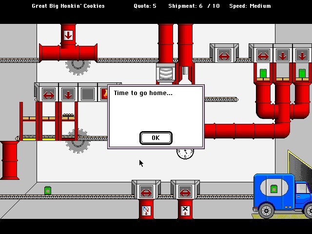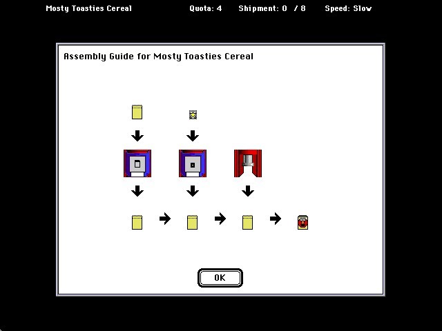 Вверху основного экрана игры размещены текстовые указатели: наименование уровня (а точнее – название компании, выпускающей потребительский товар, которому посвящён наш текущий рабочий день), производственная квота (количество единиц, которое должно быть собрано для успешного выполнения плана), показатель отгрузки готовой продукции, состоящий из двух чисел (первое – это количество предметов, добравшихся до грузовика, то есть до конца сборочной линии, а второе – общая вместительность указанного вида транспорта, как правило намного превышающая приведённую левее квоту: всё, что произведено сверх плана, идёт только на пользу, в бонусы к нашей зарплате). Наконец, здесь же указывается и текущая скорость конвейера: «медленная», «средняя» или «быстрая»; переключаться между ними, сообразно уместному на данном уровне и предпочитаемому нами темпу работы, можно при помощи сочетаний ⌘S (ускорение) и ⌘W (замедление), – напомним, что за клавишу ⌘ в современных эмуляторах отвечает, как правило, «Alt». Кроме того, имеются в меню и прочие управляющие команды: ⌘P включает и выключает режим паузы; ⌘Q позволяет вернуться на рабочий стол; ⌘R означает выход на пенсию – то есть на заглавный экран с возможным занесением в таблицу рекордов. Для начала новой игры придётся сначала загрузить желаемый Месяц сочетанием клавиш ⌘О (в зарегистрированной версии; для пользователей Shareware в любом случае доступен лишь Декабрь), а приступать к работе, введя своё имя, следует при помощи ⌘M.
