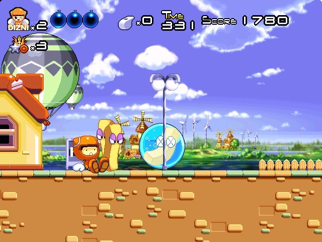 Если же недруги окружили, - а такое не просто возможно, а часто очень даже вероятно, тем более что, увы, в некоторых местах последние способны возникать у вас за спиной в буквальном смысле из воздуха, - то защищаться теми же шарами формально всё равно дозволяется, но здоровье будет убывать с ужасающей быстротой, а никакой "брони", как и прочих полезных бонусов, в BnB Adventure не существует в принципе. Обязательно стоит отметить и то, что "сила" этого самого вредного воздействия от атак тех или иных врагов и вообще от опасностей различна: страшнее всего именно, с позволения сказать, "близкий контакт" с существами, способный "опорожнить" один из наших шаров более чем наполовину, тогда как случайное наступание на шипы или даже прямое попадание овощной ракеты причиняют гораздо меньше бед.