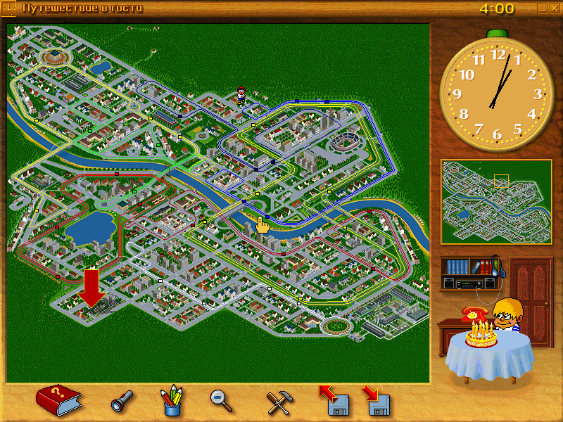 Первая мини-игра называется «Путешествие в гости». Белобрысого мальчика зовут Дима, и у него сегодня день рождения: на праздник он приглашает своего друга Колю, вместе с которым нам и предстоит действовать. Проблема в том, что ждать нас именинник согласен всего лишь три часа, от часа до четырёх пополудни, – задумчиво глядя на тортик с горящими свечами в нижней части правой интерфейсной панели, прямо под тикающими сверху часами и расположившейся посерединке мини-картой города. Как правило, Коля находится на одном конце этого последнего, а дом Димы – на другом, и задача наша заключается в том, чтобы переместиться в нужном направлении до истечения срока, управляя фигуркой героя в основном окне. Пешком идти бесполезно - не успеем, а значит, придётся пользоваться общественным транспортом (такси здесь нет, только автобусы и трамваи). Для этого стоит нажать на стаканчике с карандашами, дабы отобразить на глобальной карте все доступные маршруты, – а затем, проанализировав их сочетания, при помощи значка с лупой приблизить вид на урбанистический пейзаж, где можно будет подвести героя к нужной остановке (с точным соблюдением правил дорожного движения, нарушать которые Коля категорически откажется: например, улицу он решится переходить исключительно в положенных местах). На каждой из станций имеется расписание, отображающееся по нажатию левой кнопки и позволяющее рассчитать маршрут, сверяясь с часами справа вверху; как только в соответствующее время к нам подойдёт трамвай или автобус, в него можно будет зайти, – причём вместо покупки или проверки билета необходимо будет решить на правой панели несложную задачку на сложение минут. Собственно, этим действом «математический» характер данного приключения исчерпывается, – в куда большей степени путешествие по городу способно развить навыки ориентации на местности и основы, что называется, «тайм-менеджмента». Поскольку расположение маршрутов транспорта и начальной и конечной точек нашего путешествия определяется случайным образом, задача посещения друга может оказаться очень даже непростой. В случае же успеха наш герой постучит в дверь, перед которой сидит Дима внизу интерфейсной панели, и вскоре лично появится в комнате с букетом цветов в руках, – этой же дверью можно в любой момент воспользоваться для перезапуска игры или для выхода в главное меню.