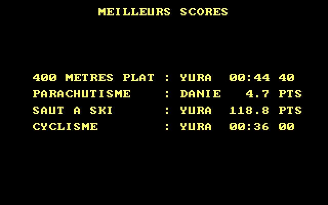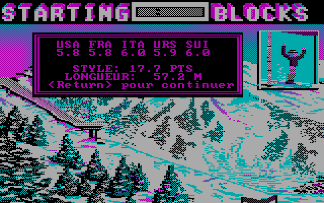 В режиме практики любой этап можно повторить сколько угодно раз, выбирая при помощи всё тех же стрелок между вариантами «Oui» и «Non»; в случае же состязания у нас имеется всего по одной попытке на забег и парашют и по две – на лыжные прыжки и велосипед. Рекордсмены получают возможность запечатлеть своё имя в таблице лучших из лучших, – ну и, разумеется, взойти на пьедестал почёта и принести своей части света как можно больше медалей. Что-либо выдающееся «Starting Blocks» собой вряд ли представляет, но вполне способна увлечь, особенно такой необычной подборкой дисциплин для состязания. Стоит также заметить, что в версии для Amstrad CPC присутствует ещё и пятый вид спорта, заплыв вольным стилем на 50 метров, – зато достоинством РС-варианта игры оказывается куда большая степень редкости.