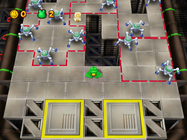 Естественно, повсюду вокруг водятся недружелюбные существа разных типов и размеров, но напрямую сражаться с ними персонаж, увы, не может: их придётся аккуратно обходить (благо что ходят они строго по заданным траекториям), заранее просчитывая свой маршрут (последнее, кстати, требуется делать и просто во время прохождения, запоминая, например, интервалы движущихся платформ). На каждом уровне имеются точки сохранения - светящиеся клетки; если на такую наступить, то после гибели лягушонок будет возрождаться в этом месте. Разумеется, как уже косвенно отмечалось выше, в наличии несколько "жизней" (но вот запас здоровья в их пределах отсутствует), - и справедливости ради стоит отметить, что участки с твёрдой почвой, где можно "отдохнуть" от прыжков, тоже имеются.