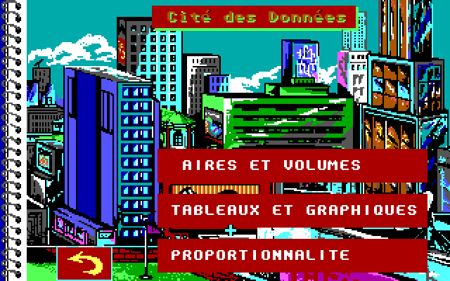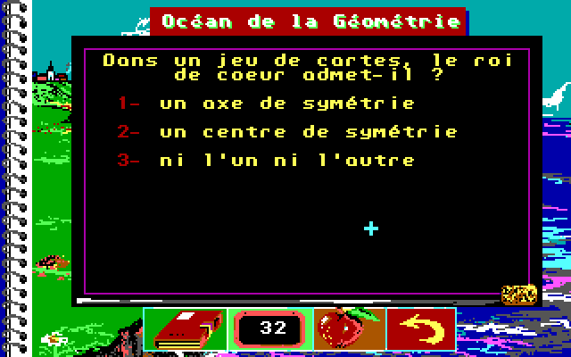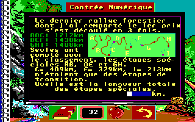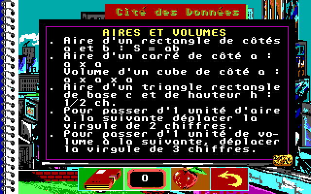 «La Bosse des Maths», «математическая шишка», – так в печально известной теории Франца Галля именовалась некая выпуклость на черепе, якобы отвечавшая за наличие у своего носителя способностей к точным наукам. Выражение это получило распространение и за пределами френологии, нередко использовалось в научно-популярной литературе, а в 1980-х годах дало имя созданной Филиппом Трюка и Мюриэль Трами из Coktel Vision серии обучающих игр для французских школьников. А если точнее, то коллежан – учеников возрастом от 11 до 15 лет, для которых было разработано по четыре отдельных выпуска, предназначенных для классов с шестого по третий (напомним, что нумерация на родине Декарта и Галуа ведётся в обратном порядке, по убывающей). Все издания выходили сразу на пяти платформах, и если варианты для Amstrad CPC и Thomson (надо заметить, наименее привлекательные внешне) уже все найдены, то более прогрессивные Atari ST и Amiga представлены сегодня в лучшем случае одним-двумя выпусками, ну а инкарнации для РС и вовсе отсутствовали в сети – вплоть до лета 2018 года, когда усилиями энтузиастов нашего сайта была обнаружена и доведена до рабочего состояния представленная на данной страничке версия игры для пятого класса. То есть одна из наиболее простых, – так что решение местных задачек не должно составить проблему даже для взрослых пользователей, давно подзабывших школьный курс алгебры и геометрии. Стоит также добавить, что по внешнему своему виду DOS-издание ничуть не уступает всем прочим, а скорее даже их превосходит (что для проектов конца 1980-х случай, в общем-то, нетипичный).
