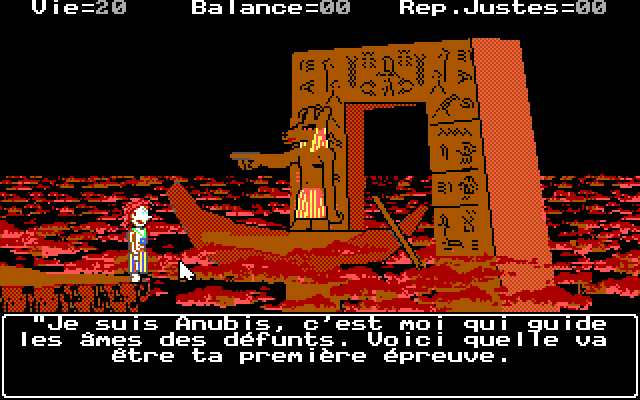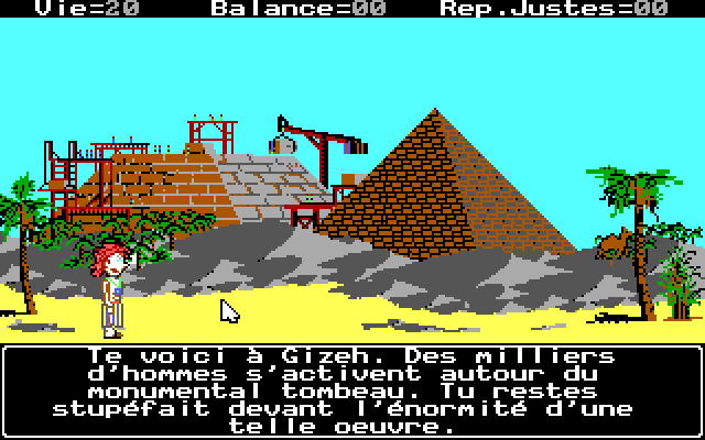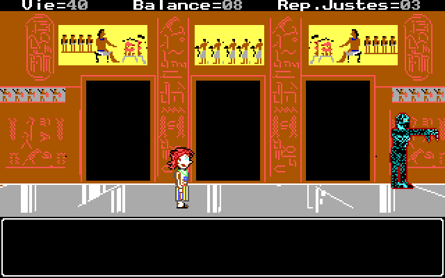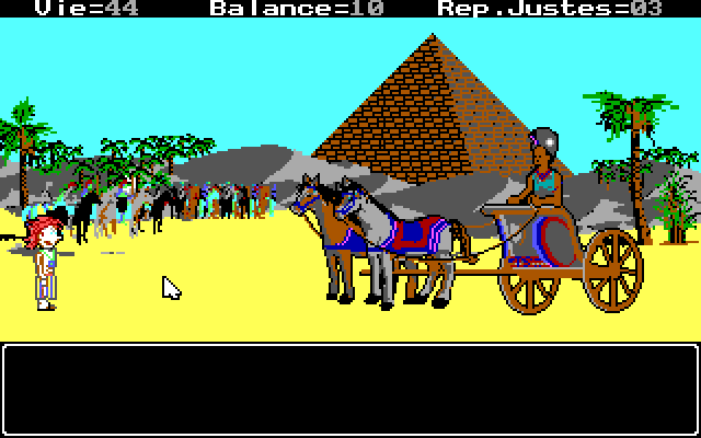 Индикатором успешности или тщетности наших усилий выступают три «ролевых характеристики», отображаемые в верхней части экрана. Прежде всего, это «Vie», на начало игры равная двадцати очкам и в дальнейшем возрастающая или уменьшающаяся сообразно уместности наших поступков, – при «сражениях» эта жизненная сила будет соотнесена с аналогичным показателем нашего вечного врага, определяя таким образом исход поединка. Второй показатель, «Balance», более наглядно символизирует успех в водворении мира и справедливости в кризисные моменты истории древнеегипетской цивилизации, начинаясь с нуля и постепенно увеличиваясь по мере наших благоразумных действий. Наконец, крайний счётчик справа, «Rep.Justes», означает баллы, полученные за правильные ответы на последнюю викторину (и потому никогда не превышает числа три, ибо ровно столько вопросов нам предлагают за раз).