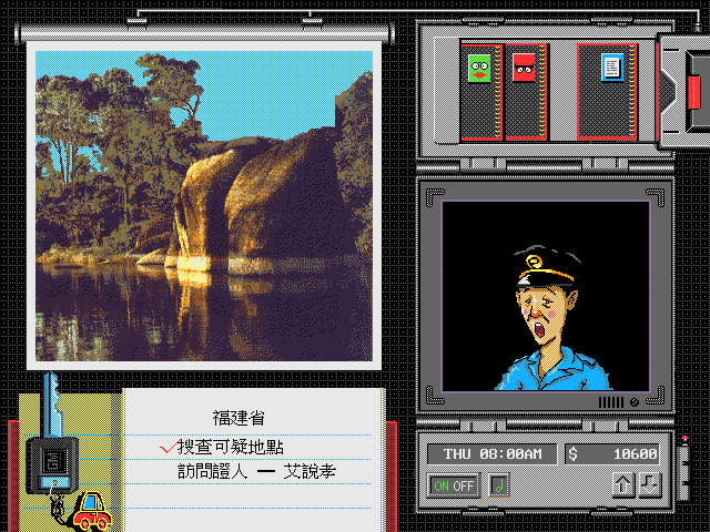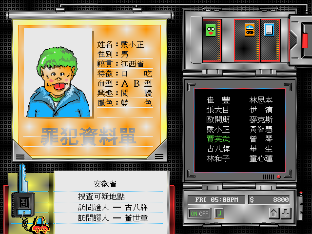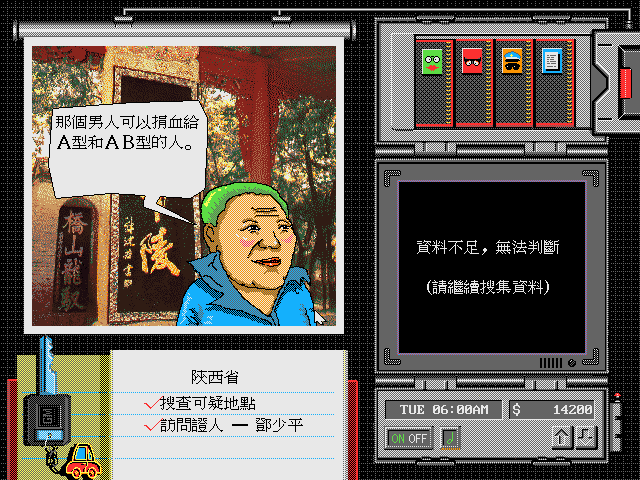 Сверху от компьютера расположен ряд дискет. Это пункты меню. Дискета с зелёной рожицей вызовет главный из них. В нём будут расположены подпункты: перечень дел о кражах (竊案委託書); «зал славы» выдающихся детективов (偵探名人堂); информация об игроке (玩家資料庫) – остаток средств, количество раскрытых/не раскрытых дел, квалификация; а также библиотека (地理圖書館), – тут собрана географическая информация обо всех уголках (провинциях) Китая. Зачем это нужно простому «сыскарю» – непонятно. Следующая дискета-меню в виде красной рожицы, - это как нетрудно догадаться, личные анкеты известных преступников (罪犯資料單). Тут указаны: имя (姓名), состоящее из двух-трёх иероглифов; пол (性别); группа крови (血型); место рождения (籍貫), – вероятно, это чисто китайская специфическая особенность, ведь происхождение сильно влияет на говор преступника, что легко могут определить любые свидетели; особые приметы (特徵); хобби (興趣); и цвет одежды (服色). Рож... лица преступников все колоритные и выполнены в характерном тайваньском карикатурном стиле.