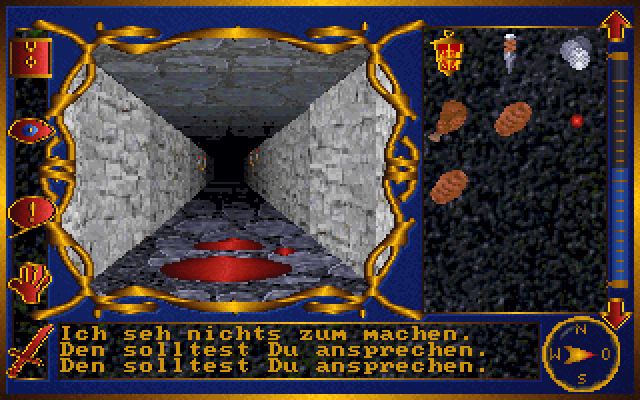 Слева расположены иконки действий: дискета для вызова основного меню (с привычными опциями сохранения, загрузки и выхода), глаз для осмотра (а точнее, для вывода комментария героя относительно достойных интереса объектов в его поле зрения – в текстовом окне в самом низу экрана), «пузырь» для разговора (только если на расстоянии одной или двух клеток перед нами находится другой персонаж, – в этом случае основное окно локации сменится его более-менее фотореалистичным портретом, слева будут располагаться реплики нашего собеседника, а ниже – пронумерованные варианты ответов протагониста), рука для использования предметов (позволяющая, например, открыть видную прямо по курсу дверь) и меч для силового способа взаимодействия со встречными стражниками (об этом чуть позже). Что весьма удобно, все эти действия дублируются и с клавиатуры – соответственно, при помощи «d», «a», «m», «h» и «s»; кроме того, нажатие «х» будет означать выход из игры, F1 вызовет внутриигровую помощь (с перечислением упомянутых выше клавиш), а F2 позволит сменить настройки (включить и выключить музыку, речь и анимацию). Отчасти команды можно отдавать и при помощи мыши: так, простой клик на запертом сундуке будет тождественен нажатию клавиши «h». Наконец, важнейшую функцию отображения карты локации выполняет правая кнопка мыши или «k» на клавиатуре: подобно всё тем же старым ролевым играм, схема помещений создаётся по мере исследования нами таковых, выглядит весьма условно и, к сожалению, не снабжена прокруткой.