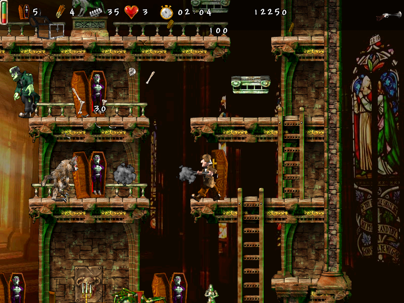 Во-вторых, на каждом уровне у нас будет как минимум один враг — Игорь, огромный зеленокожий гуманоид в лохмотьях, выглядящий как стереотипный «монстр Франкенштейна», перемещающийся (и в том числе прыгающий) почти с той же скоростью, что и ван Хельсинг, а главное — совершенно неуязвимый. При наличии «полного здоровья» и большой удачи герой может его перепрыгнуть, лишившись почти всего запаса жизненных сил, но вот столкновение с этим индивидуумом «лоб в лоб» гарантированно приведёт к проигрышу независимо ни от чего. В дополнение к своей непобедимости Игорь обладает ещё более неприятной способностью: сразу же после старта нашей праведной деятельности по искоренению нечисти он начинает лихой «забег» по уровню, открывая крышки «обработанных» нами гробов и (по-видимому, ибо в деталях это не демонстрируется) извлекая колья из сердец вампиров, после чего те снова обретают зловеще-цветущий вид, — именно поэтому бонусы в виде связок деревяшек и восстанавливаются сколько угодно раз. Соответственно, нужно добиться того, чтобы в конкретный момент времени все имеющиеся на данном этапе гробы были закрыты, — только тогда мы получим доступ к следующему.