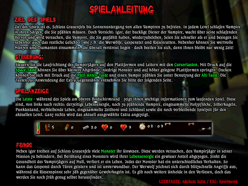 Как ни странно, здешние вампиры совершенно не агрессивны (и не способны к сопротивлению) — они спокойно спят себе в открытых гробах; задача отважного учёного — за ограниченное время успеть найти их всех, вбить каждому кол в сердце и затем закрыть крышку (за два последних действия отвечает однократное нажатие «Alt» при нахождении рядом с целью); поскольку формально данный платформер, по-видимому, ориентирован на юную аудиторию, то демонстрируется вышеописанный процесс максимально «щадяще» (если вдруг кому-то жалко клыкастых чудовищ). Однако на самом деле Vampirjagd — вещица по своей сложности ни разу не детская: проблем и врагов у нас здесь хватает и помимо тикающего таймера.