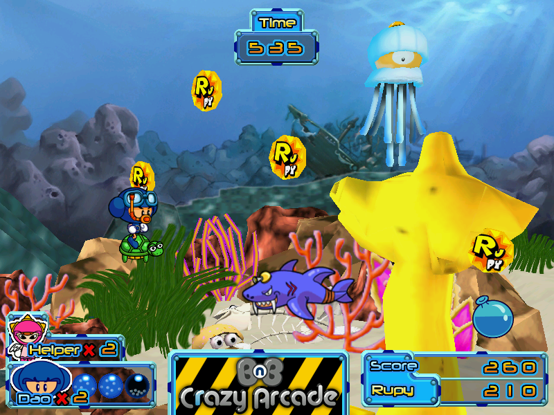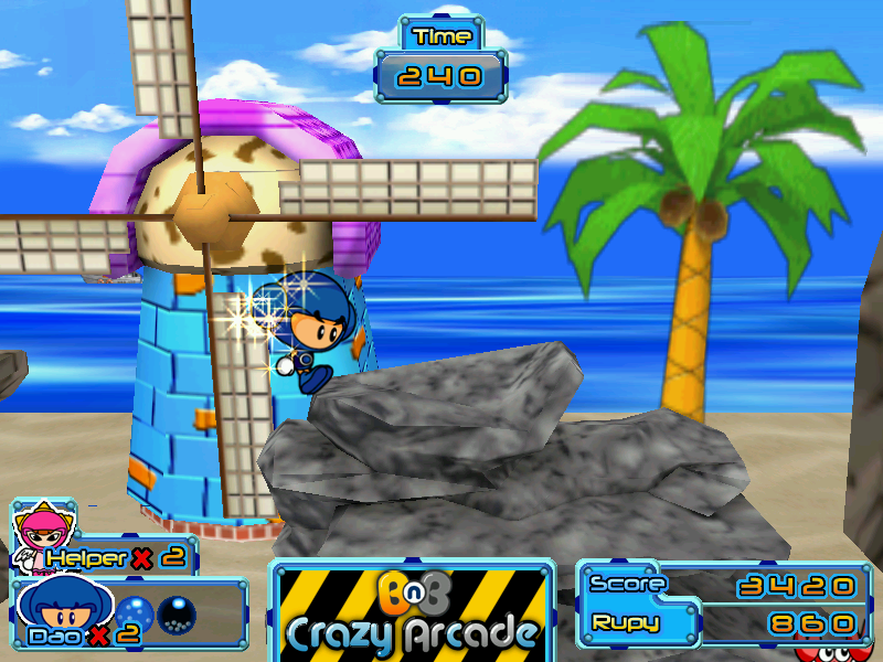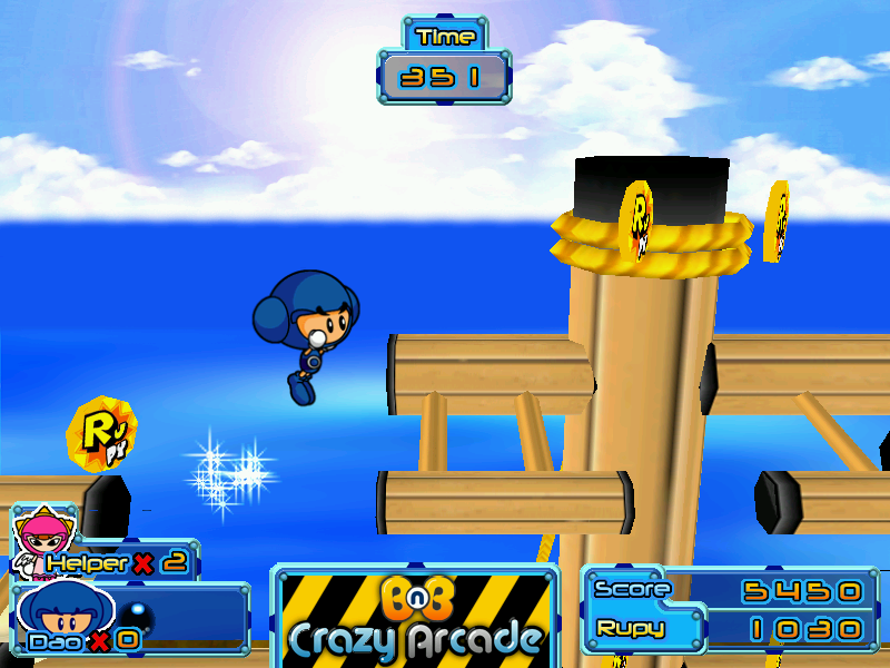 К чести разработчиков следует отметить, что они всё-таки постарались сделать небольшие и, если откровенно, малоинтересные уровни максимально разнообразными с точки зрения антуража. Так, даже в рамках первого мы, по сути, посетим целых три «мира»: деревеньку, пляж и пиратский корабль. Дальше будет много всего другого: от леса и морских глубин до стройплощадки. Периодически встретятся также и бонусные отрезки, где типичная для платформеров перспектива «сбоку» уступит место виду от третьего лица, а герою вместо сражений придётся ездить по рельсам на вагонетке или бегать по пересечённой местности. Управление более-менее стандартное: за прыжок отвечает «Alt», за атаку, для которой используются бесконечные шары с водой, знакомые по первой части, — «Ctrl», за кратковременный призыв какого-либо помощника из числа персонажей сетевой Crazy Arcade (что в BnB 2 доступно уже с момента старта первого уровня, а в левой нижней части экрана указано количество оставшихся «эвокаций») — «Shift». На каждом из «обычных» этапов можно найти точки автоматического сохранения — столбики, увенчанные литерой «S». Обратите внимание, что присутствует ограничение по времени, пусть и достаточно гуманное.