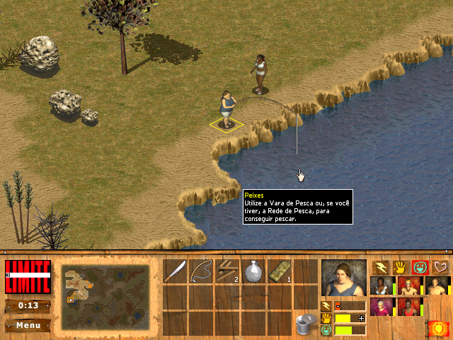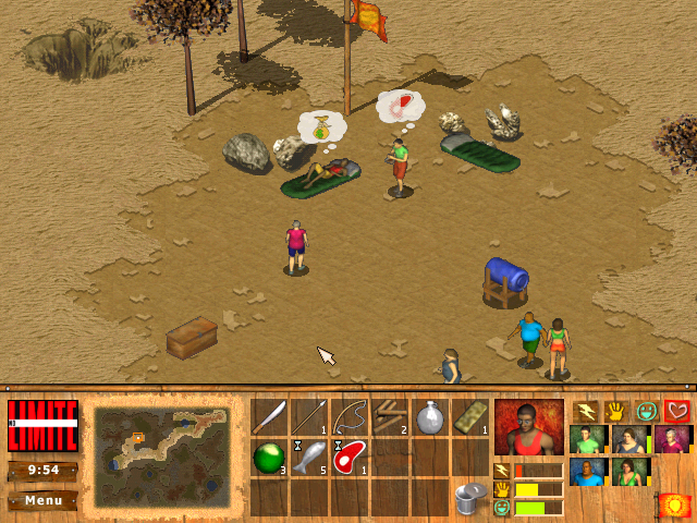 Точно так же мы вправе поступать и с рыбой и кокосами, — но можно относить всё (или не всё) найденное в общий ящик с провиантом в лагере (и очень желательно в рамках каждого «дня» снабжать его хотя бы одной единицей провизии). Кроме того, на протяжении трёхминутных «суток» разрешается общаться с каждым из членов своей команды, выбирая те или иные темы для беседы; никакого реального знания португальского языка не потребуется (максимум — перевести несколько слов в соответствующем подменю), ибо озвученные диалоги очень краткие и представляют собой сущую абракадабру (в буквальном смысле). Вместе с тем разговоры о предметах, интересных собеседнику (именно для этого ещё перед стартом полезно изучить чужие увлечения), повышают его расположение к вам и улучшают ваше настроение, плюс с помощью отдельного пункта упоминавшегося подменю можно строить «заговоры» против определённых членов команды, подговаривая других голосовать против них, или даже персонально угощать кого-нибудь добытой нами пищей. Сами «соплеменники» иногда тоже подходят к нам для беседы, но случается это почему-то редко (хотя между собой они болтают очень охотно, а благодаря пиктограммкам, появляющимся над любыми разговаривающими лицами, мы даже можем примерно понимать, о чём ведётся речь). Если к моменту завершения «суток» мы находимся далеко от лагеря — то ничего страшного не происходит.