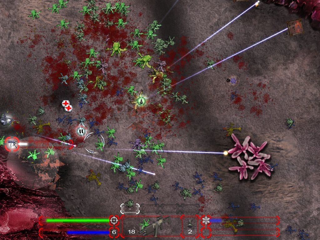 Игровой процесс не скрывает того, что является преемником Crimsonland, и похож на неё даже больше, чем на Alien Shooter. Мы будем проходить уровень за уровнем, истребляя полчища врагов, вырывая из их внутренностей бонусы и мотая на ус опыт, который пойдёт на прокачку навыков и характеристик. Теоретически можно выбрать персонажей пяти разных типов, немного различающихся стартовыми данными, - но впоследствии расхождения сгладятся. Несколько озадачивает тот факт, что новое оружие появляется только в определённых сюжетом местах и имеет ограниченный боезапас, так что к первоначальному автомату всё равно придётся возвращаться, а он по мере прогресса будет становиться всё менее эффективным. Но у нас есть ещё и гранаты, которые активно решают проблемы с большими скоплениями врагов и даже боссам наносят солидный урон.