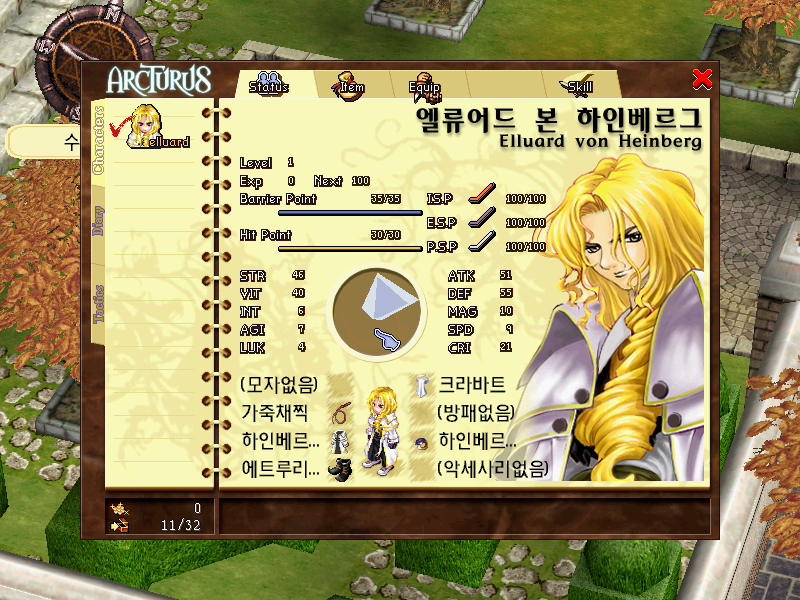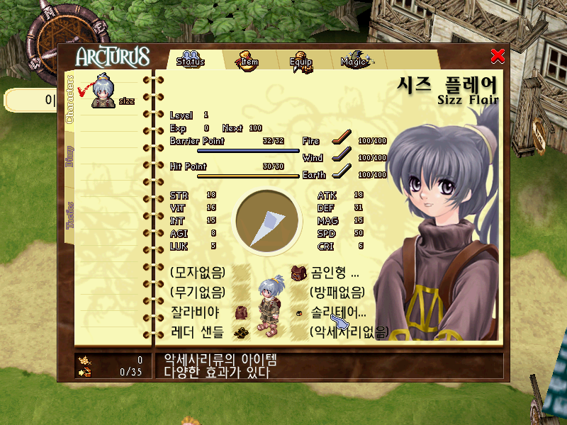 Интерфейс поделен на несколько секций: персонажи, дневник и тактические стили. В первой просматривается статус членов партии, предметы, их использование или надевание, просмотр магии и спецприемов. Инвентарь можно сортировать по пяти типам - оружие (무기), броня (방어구), аксессуары (악세서리), прочее (기타) и показывать всё (모두보기). При этом по размеру он ограничен, и поначалу там можно хранить не так много всего, - но постепенно лимит будет увеличиваться. Экипироваться же можно максимум восемью предметами - шлемы и шляпы, оружие, броня, обувь, рюкзак, щиты, кольца и аксессуары. Во второй содержится пополняющаяся по ходу игры информация о предметах, существах и расходниках в виде их описания с указанием характеристик, а также настройки и выход в главное меню. В третьей настраивается, условно говоря, линия поведения каждого из членов отряда - ручное управление (매뉴얼), быстрые атаки (열혈공격), атака по ключевым противникам (공격우선), избегание попаданий (도망우선), поддержка (공격지원), настройка (커스텀) - при выборе интересной функции во время боя, о которой ниже.