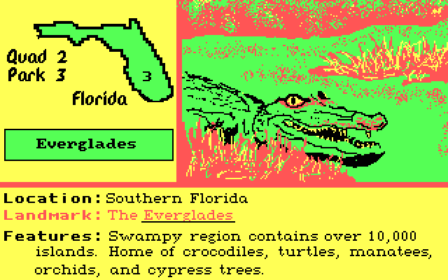Запечатлев в памяти эту важную информацию, проходим влево, к карте: здесь, выбирая поочерёдно (путём ввода вручную соответствующей цифры) сначала один из четырёх регионов США, а затем и один из трёх, четырёх или пяти представленных на более локальной схеме Национальных парков, мы должны отыскать место, где наблюдается та самая достопримечательность (причём иногда кандидатов может быть несколько), – и хорошенько уяснить, что именно является ключевой особенностью данного парка, выделенной в описании подчёркиванием (как правило, запомнить это нетрудно, ибо таковая часто совпадает с его названием и представлена помимо текстовой информации ещё и на какой-никакой иллюстрации). После этого требуется проследовать на вертолётную площадку – и выбрать один из семнадцати пунктов назначения, введя сначала соответствующий номер в списке, а затем – в обязательном порядке – и ту самую его «изюминку» (например, в парке «Гранд-Каньон» это – да, «Grand Canyon»; в «Эверглейдс» – вы опять угадали – «Everglades»; а вот, скажем, в «Роки-Маунтин» это уже «100 Peaks», ну и т. д.).