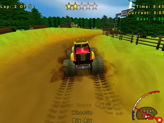 Последних, увы, совсем немного, и фактически они ограничиваются лишь длинными прыжками и сальто на автомобиле в воздухе; для покорения высоких препятствий необходимо использовать ускорение (это возможно лишь в том случае, если колёса машины стоят на земле, тогда как "финты" - напротив, только в воздухе). Управление в целом на удивление простое - и подробно расписано в приложенном руководстве; совсем аркадным, правда, его назвать нельзя, и если вы во что-то врежетесь, то должны будете потратить сколько-то секунд на выравнивание положения автомобиля, но ничего трудного в этом нет, то есть местная физика не имеет с реальностью почти ничего общего. Как-либо повредить или тем более разбить автомобиль тоже невозможно. Помимо описанного выше, имеется возможность создания собственных трасс и "настройки" (именно в кавычках) внешнего вида своего монстр-трака. Однако радости всё это принести не способно - по причине вопиющей простоты игрового процесса. Дело в том, что проиграть здесь, похоже, невозможно в принципе, а выделывать те же трюки для заполнения шкалы очков и преодоления абсолютного большинства препятствий вовсе не обязательно, - это расстраивает. Кроме того, во время езды нередко возможно (или даже необходимо) частично или полностью ломать другие транспортные средства (обычные автомобили, строительные машины и даже небольшие самолёты) - статичные и являющиеся теми самыми препятствиями; подобное тоже не слишком приятно. Никаких скрытых трасс нет, и максимум, что можно заработать в "карьерном" режиме, - это уже отмечавшийся доступ к новым монстр-тракам, формально предназначенным для одного из трёх перечислявшихся видов треков, но по факту практически не имеющим между собой реальных отличий.