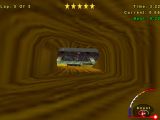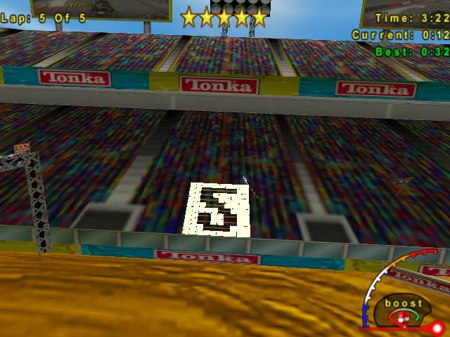 Начать следует с того, что Tonka Monster Trucks - это, собственно говоря, не гонка на монстр-траках (открытых внедорожниках с очень большими колёсами), как можно было бы подумать, а фактически аркада с видом от третьего лица, ибо никаких компьютерных соперников здесь нет (хотя мультиплеер и предусмотрен). На выбор предлагается два режима: "быстрый старт" и "карьера"; в первом мы выбираем себе трак и трек, однако достигнутые результаты ни к чему не приведут; во втором же предполагается последовательное (но в произвольном порядке) прохождение трасс с целью заслужить право выступать на других разновидностях внедорожников, так как первоначально нам доступен лишь один таковой. Треков мало, они делятся на три типа: для гонок, трюков и фристайла. Гоночные представляют собой небольшие кольцевые трассы с незначительным количеством препятствий; наша цель - проехать определённое число кругов и собрать как можно больше возрождающихся оранжевых ромбиков, по мере взятия которых заполняется шкала из пяти звёзд в верхней части экрана (хотя расти она будет и в том случае, если мы их не трогаем, то есть сама по себе по мере перемещения, - просто медленнее), - как только это произошло, можно быть уверенными, что оценку за заезд мы получим максимальную. Трюковые трассы больше по размеру и имеют финишную точку, достижение которой знаменует её завершение; здесь уже придётся преодолевать какие-никакие препятствия. Ограничения по времени, как и в гонках, нет, возрождающиеся оранжевые бонусы присутствуют, - то есть можно сначала добиться заполнения упоминавшейся выше шкалы, а потом так или иначе добраться до финиша, и как бы неумело ни было это исполнено, но высший балл мы при таком раскладе опять-таки получим. Наконец, фристайл представляет собой большую прямоугольную арену с препятствиями, где нет финиша как такового, но зато установлен временной лимит; бонусы опять-таки есть, но добывать их чуть посложнее, чем на двух других типах трасс, поэтому на момент истечения отведённого срока теоретически можно и не набрать пяти звёзд (хотя вас всё равно похвалят). Доступен также отдельный тренировочный трек, где нет бонусов и поясняются способы исполнения трюков.