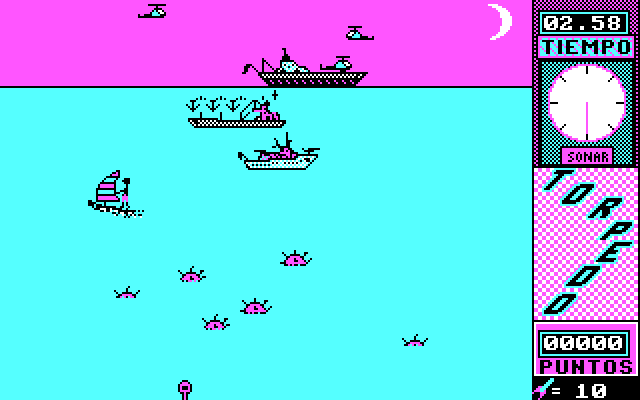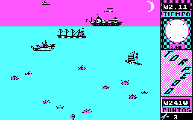Графика в "морском бою" довольно простенькая, а вот в первой фазе на удивление - для игр этой конторы, конечно, - качественная, ибо модель моряка занимает собой чуть ли не треть экрана и не только тщательно прорисована, а даже кое-как анимирована. В общем и целом - довольно просто и примитивно, но в качестве развлечения на несколько минут сойдёт; кроме того, Torpedo, как и любой продукт Ediciones Manali, является немыслимой редкостью: вплоть до декабря 2018 года в Интернете не было не только её самой, но и какого-либо о ней упоминания.