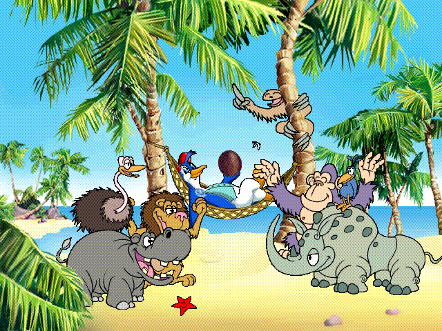 Третий уровень - усложнённый аналог первого: он чуточку продолжительнее (и, разумеется, тоже с прокруткой экрана), а к летающим рыбам и кенгуру здесь добавились грифы и - внимание - неприятные шустрые крабы, которых приходится перепрыгивать. Делать это несколько проблематично - опять-таки из-за неотзывчивого управления и сложности расчёта нужного расстояния для осуществления прыжка. Наконец, четвёртый этап, как и второй, целиком умещается в видимое нам пространство: тут придётся аккуратно прыгать по спинам появляющихся из-за правой боковой границы и движущихся "табуном" различных зверей (вполне способных нас затоптать), выбирая спины тех из них, которые позволяют туда приземляться (со львами, леопардами, броненосцами или трубкозубами это возможно, а вот с гориллами или страусами - нет), дабы в конце концов добраться до находящейся в верхней части экрана воровки-мартышки с кокосом (достать её можно лишь в прыжке): если это удаётся, то игра заканчивается. Отдельно хотелось бы отметить поистине "тотальный" пацифизм Cocco Game: иногда столкновения с летающими рыбами приводят к падению на землю не только нашего персонажа, но и его "обидчика": в подобной ситуации пингвин берёт это существо в лапы, заботливо отряхивает и затем отпускает в полёт. А ведь оно его только что ударило...