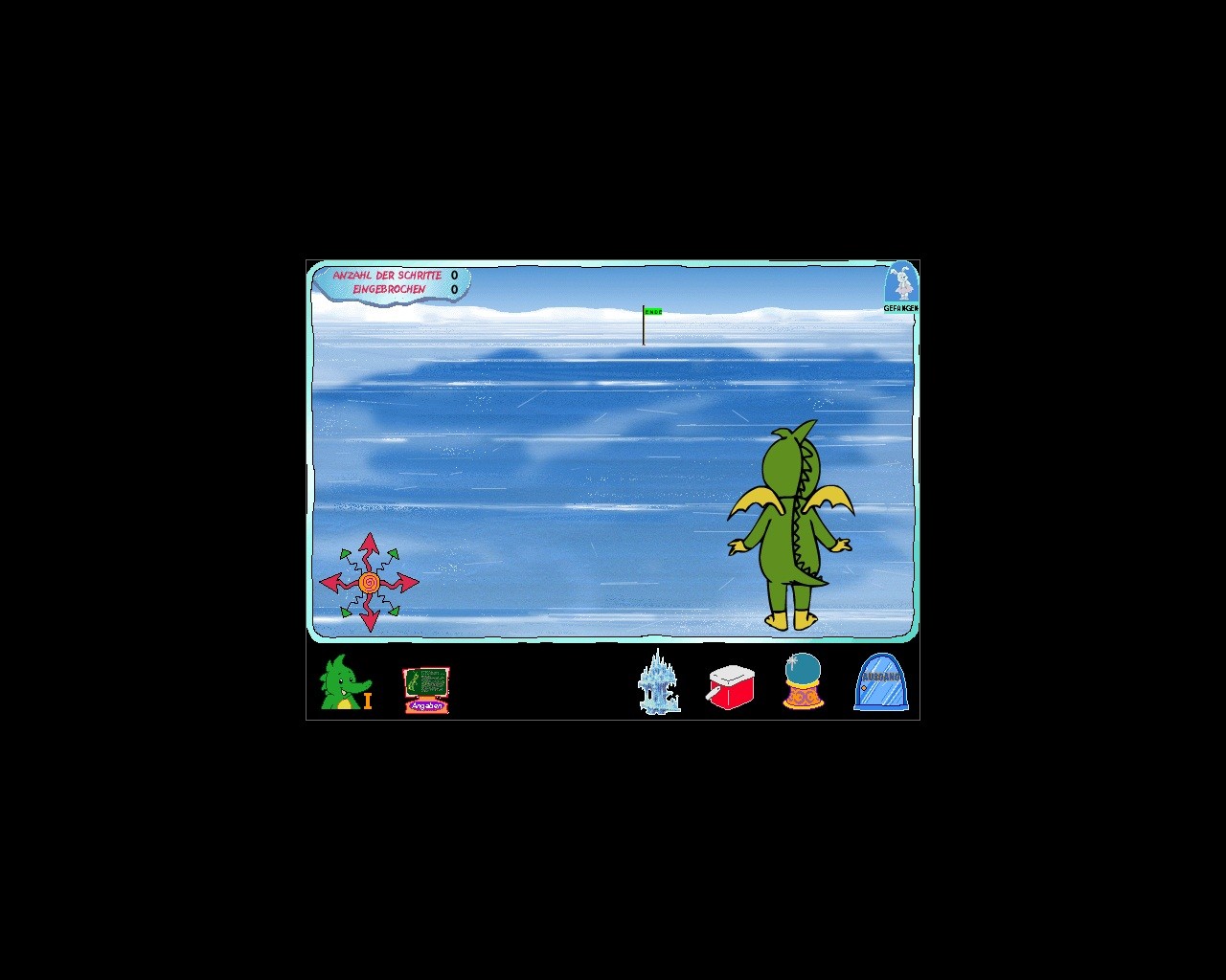 Сюжет по традиции умещается в одно предложение: Арктос каким-то образом пленил животных - товарищей Табалуги и заморозил их у себя в замке; задача игрока - помочь дракончику освободить их. По сути, Tabaluga: Die Rettung aus dem Eispalast представляет собой сборник мини-игр, слегка замаскированный под предельно упрощённый квест с видом от первого лица: изредка встречаются дискретное перемещение и минимальное взаимодействие с окружающей средой (вроде, например, подбора предмета или нажатия на что-либо) посредством изменяющего свою форму курсора, но основное внимание уделено головоломкам и аркадам, всё управление в которых опять-таки осуществляется при помощи мыши. В нижней части экрана располагается интерфейсная панель с несколькими значками: коробка открывает доступ к инвентарю (кое-какие вещи лежат там уже на момент старта), хрустальный шар сообщает общую информацию о локациях, которые предстоит посетить, а дверь служит для выхода из программы. Впоследствии слева от них будут появляться дополнительные иконки, позволяющие возвращаться как к уже посещённым местам (в некоторых из них делать совершенно нечего), так и к некоторым - но не к любым - уже однажды пройденным мини-играм.