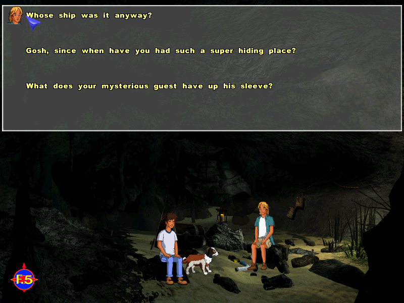 Наиболее известным творением писательницы - хотя и не единственным таковым - является цикл романов о "великолепной пятёрке", в которую входят братья Джулиан и Дик, их сестра Энн, кузина Джорджина, одевающаяся и ведущая себя как мальчик (и даже требующая, чтобы её называли Джордж), а также забавный пёс Тимми. В 1999-2001 годах по мотивам пяти наиболее известных историй об этих персонажах было сделано соответствующее количество компьютерных игр в жанре "квест", в явном виде ориентированных на детей. На данной страничке представлен самый первый из них, созданный по первому же произведению о приключениях пяти друзей, увидевшему свет ещё в 1942 году. Сюжет следующий: ребята приезжают на летние каникулы в Киррин, где родители Джорджины владеют небольшим коттеджем на берегу моря, одну из комнат которого сдают подозрительному мистеру Джонсону, профессору морской археологии, проявляющему большой интерес к розыскам обломков одного судна, затонувшего в окрестных водах много лет назад... Впоследствии выяснится, что его влечение к данному объекту имеет под собой вполне меркантильное обоснование, - а целью ребят станет остановить алчного учёного и его подручных.