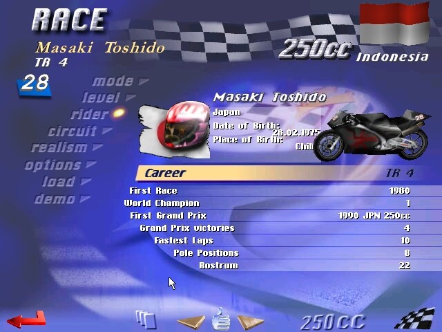 В частности, есть возможность выбора класса мотоцикла (различаются они объёмом двигателя в "cc" - кубических сантиметрах: 125, 250 и 500), водителя, уровня сложности (одного из трёх), настройки нескольких элементов транспортного средства (от шин до амортизаторов), установки погоды (понятно, что по мокрому асфальту ехать будет куда труднее, чем по сухому), переключения между перспективой обзора "из глаз" и "со спины", числа кругов, соперников, настроек реалистичности происходящего и так далее. Основной режим - чемпионат ("Grand Prix"), разделённый на три этапа: практика, квалификация (эти два разрешается - но не рекомендуется - пропускать) и "собственно гонка", причём наша стартовая позиция зависит от места, занятого по итогам предыдущего заезда (поэтому если не участвовали в практике и квалификации - то на момент начала состязания окажетесь позади других участников. Кроме того, перед непосредственно гонкой можно поучаствовать в так называемом "прогревочном круге" ("warm-up"), своего рода "контрольном тесте" мотоцикла, чтобы в случае необходимости как-либо изменить его конфигурацию перед решающим стартом.