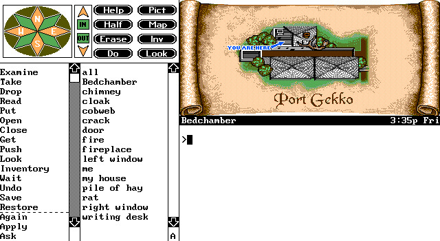 Впрочем, специально для таких и добавлен мышиный интерфейс. Вокруг да около основного окна с сообщениями расставлены окна со всем инвентарём, предметами в данной локации, компас, на котором отмечены все выходы из неё, все доступные глаголы и так далее. Там, конечно, есть далеко не всё, но этого хватит на 99% всех игровых ситуаций (кроме злой шутки про шкаф* и Острова Потерянных Душ**).